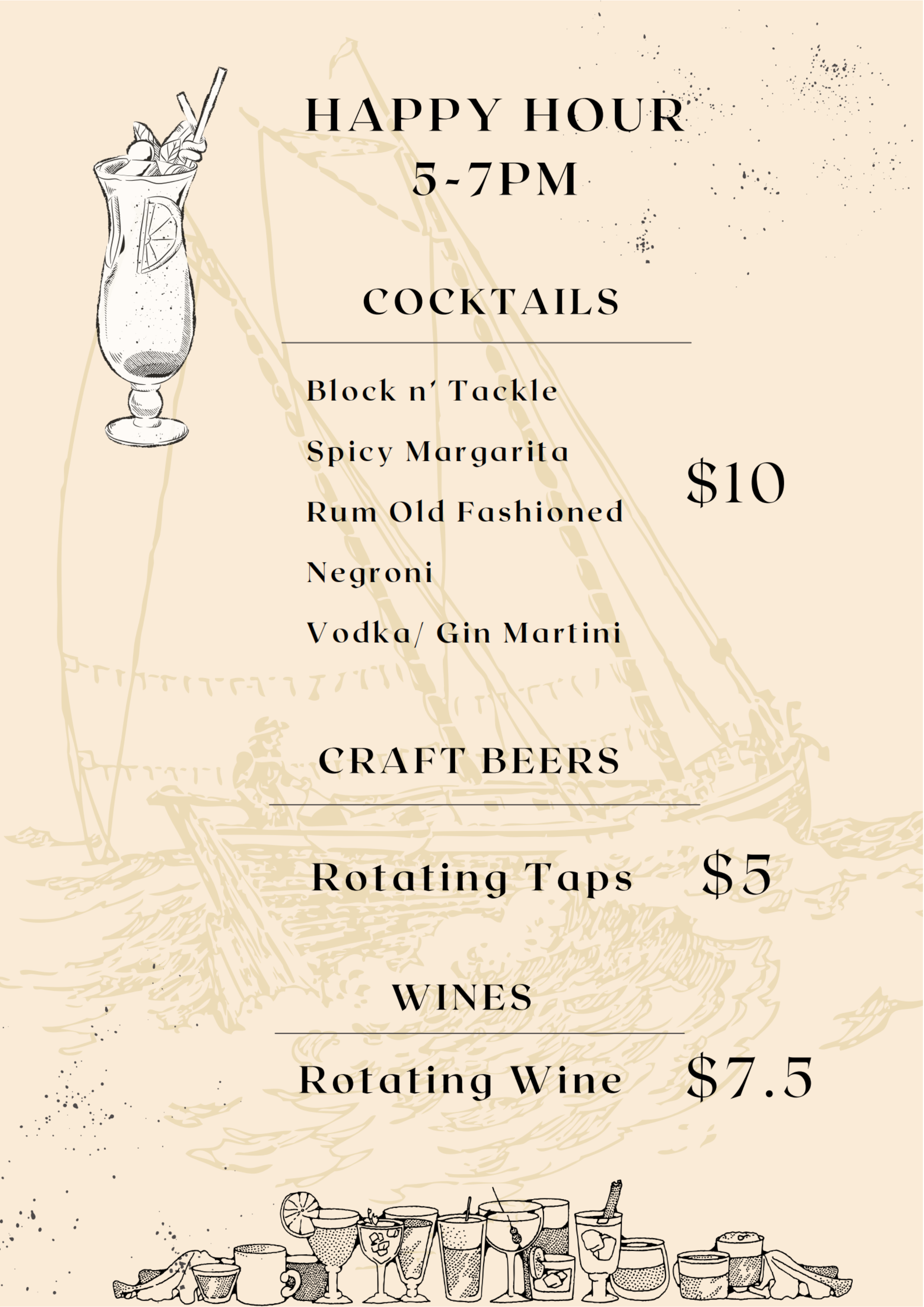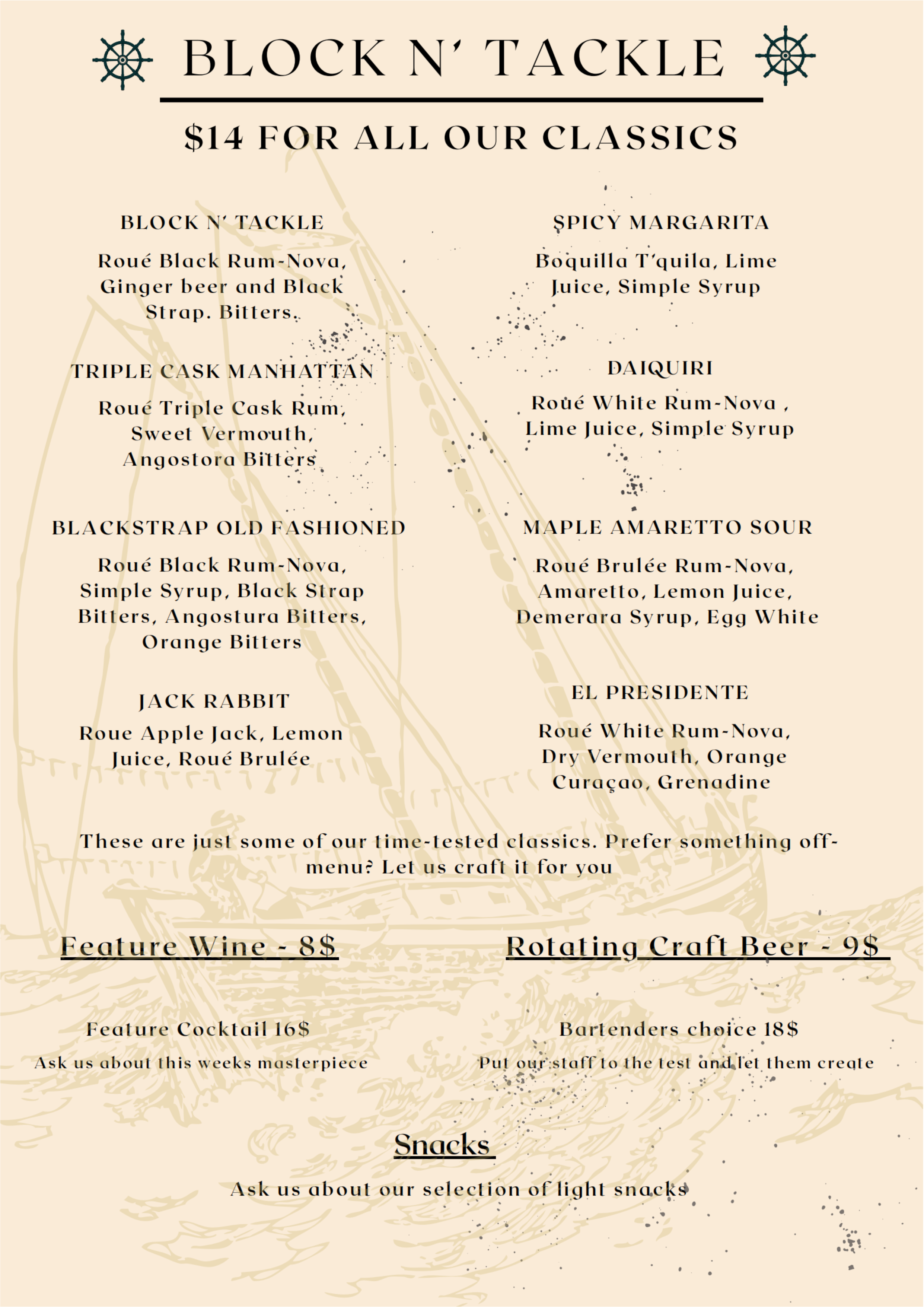 At the heart of Block N Tackle is a curated selection of James Roue Beverage Company spirits, from bold rums to small-batch liqueurs, beers and wines. Every bottle is a reflection of our coastal roots—crafted with care, bottled with pride, and poured to be shared. Our cocktail program draws inspiration from both classic recipes and modern riffs, anchored by our signature “Block & Tackle” cocktail, a tribute to the seafaring spirit of the Bluenose II.